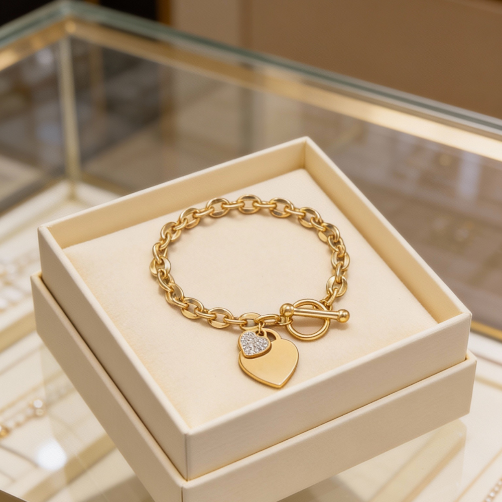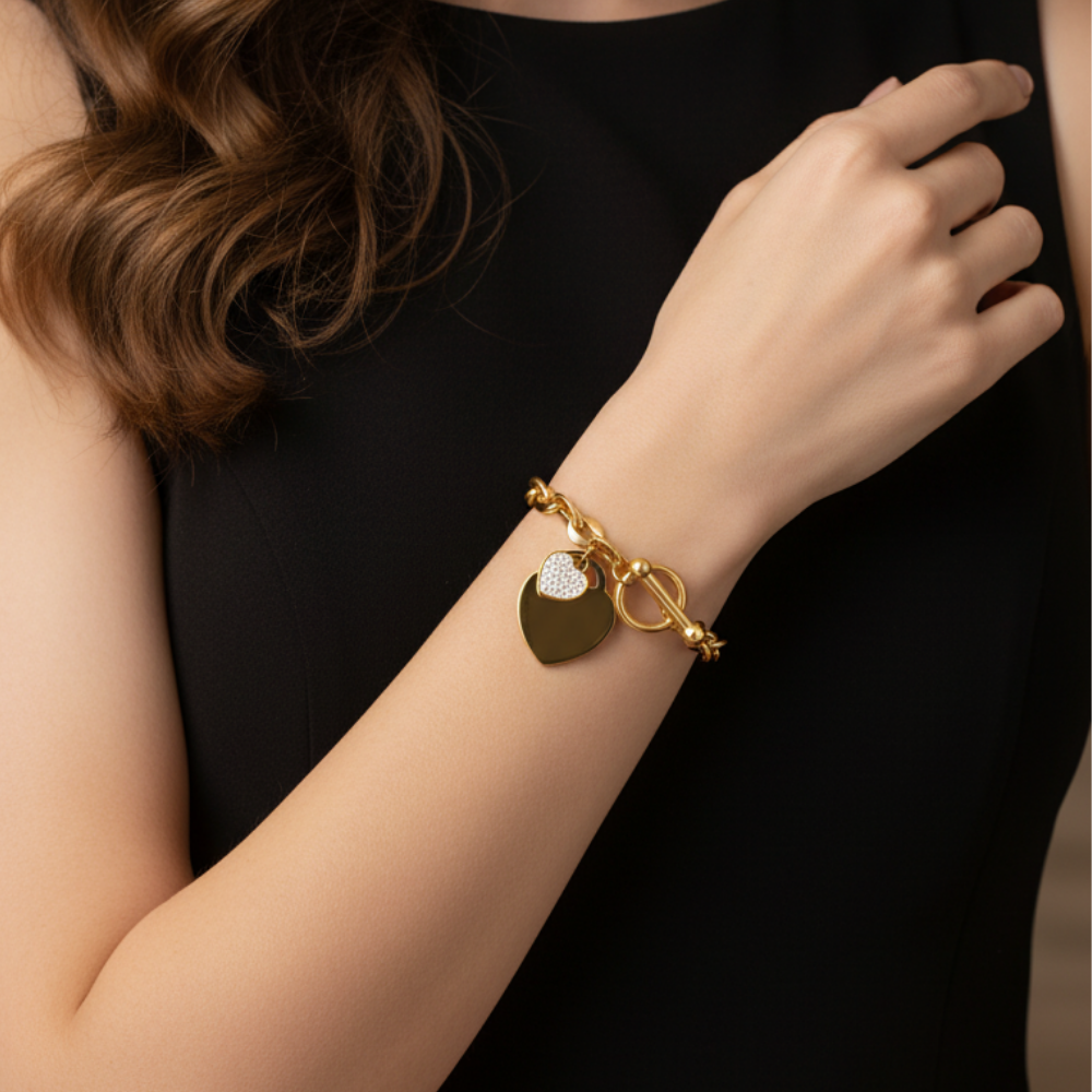 Aici o vezi în lanțul gros, perfect rotunjit, în închiderea tip toggle care arată ca un detaliu de design și în pandantivele inimă care prind lumina frumos, fără să încarce brățara.