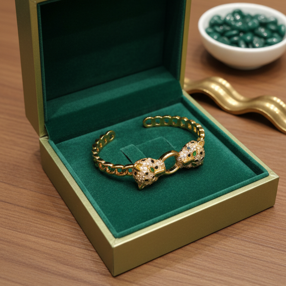 Ochii verzi ai capetelor felinei sunt acel detaliu mic care schimbă tot echilibrul brățării. Adaugă contrast, iar pe piele se vede imediat.