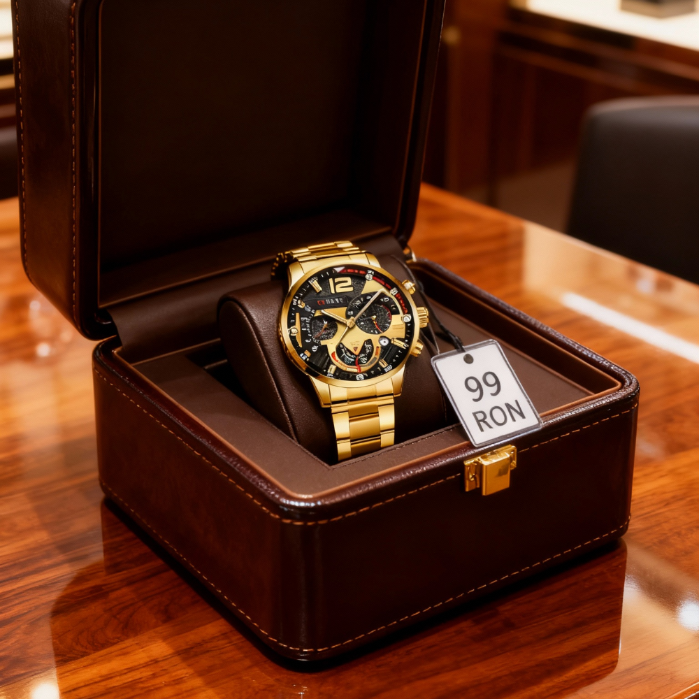Ceasul bărbătesc Geneva Auriu este creat pentru bărbații care vor un accesoriu masiv, vizibil și plin de detalii. Cadranul negru cu accente aurii și roșii, brățara metalică aurie și designul inspirat din ceasurile sport-lux îl transformă într-o piesă statement, nu într-un simplu ceas.