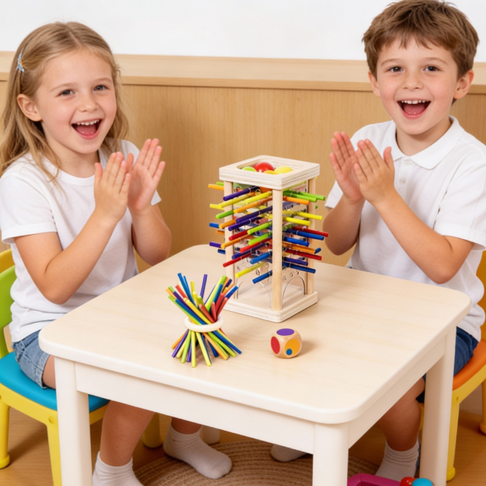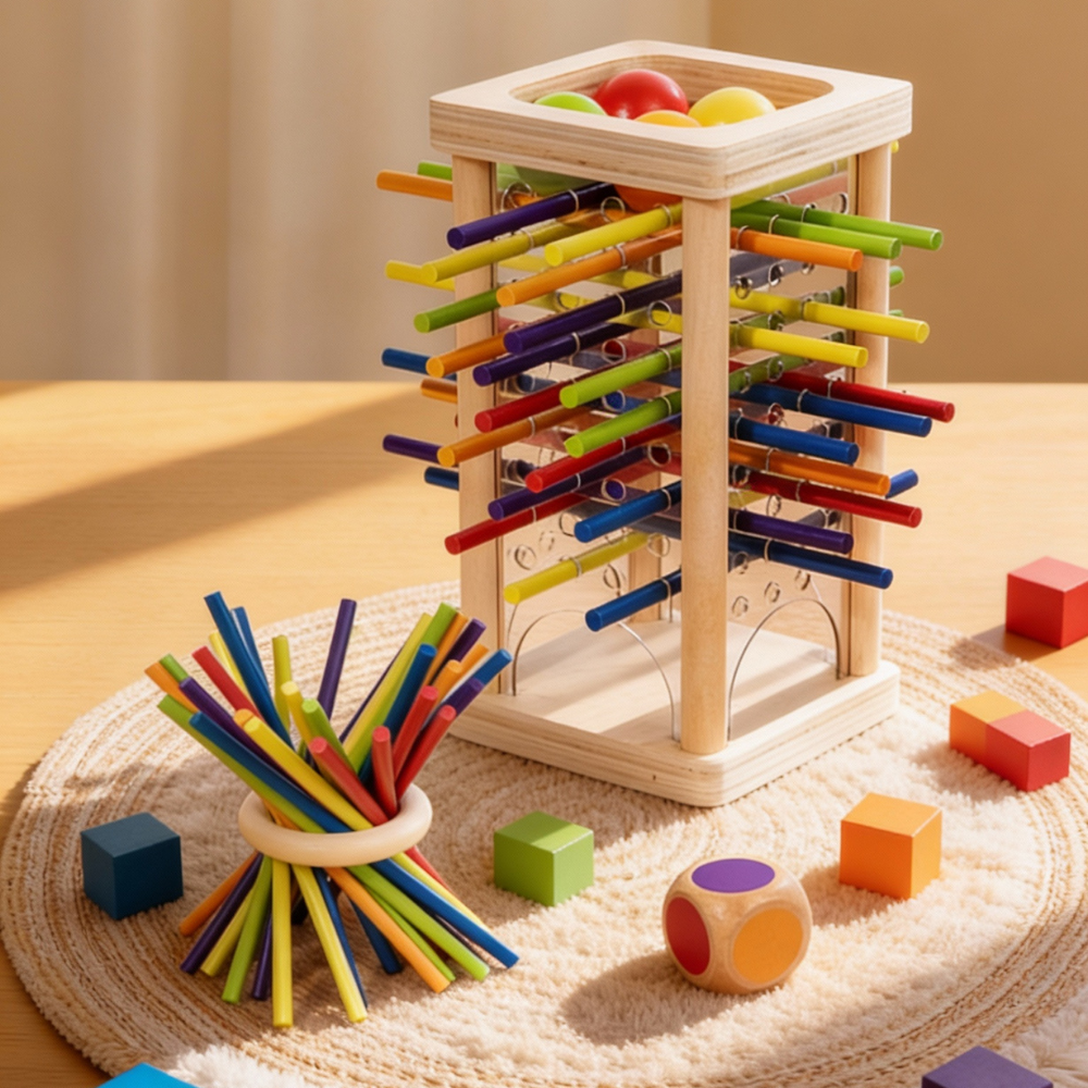 Turnul Culorilor transformă fiecare partidă de joacă într-un exercițiu de atenție, motricitate și strategie. Copiii trag pe rând câte un băț în funcție de culoarea de pe zar și trebuie să evite ca bilele să cadă. Pare simplu? Doar la prima vedere.